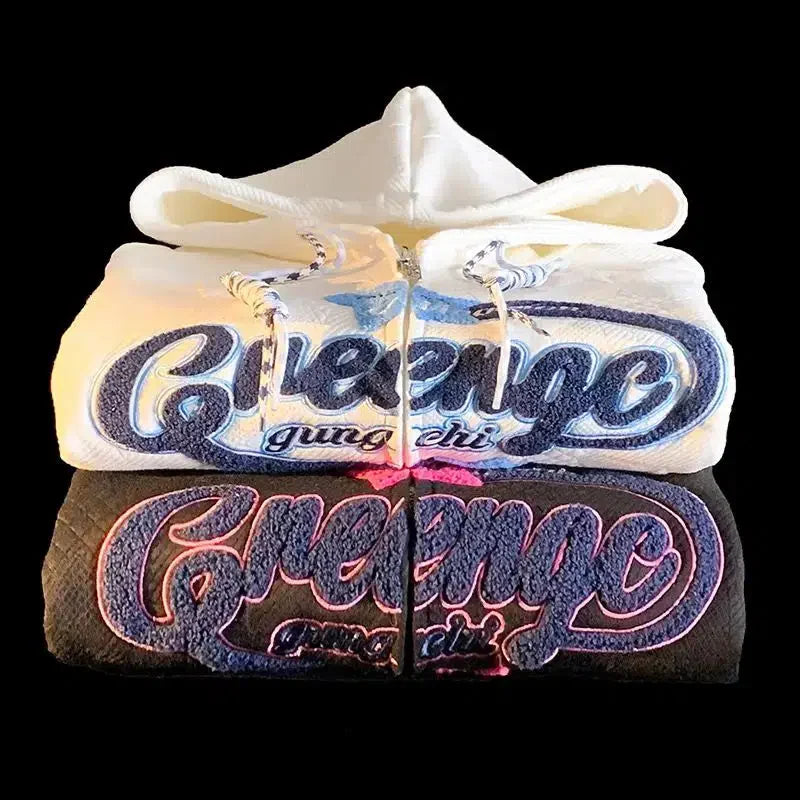 A standout feature is the large, intricately embroidered American-style logo placed prominently on the front. The logo's design incorporates shades of blue, giving it a classic and patriotic feel, while the embroidery adds texture and depth to the hoodie. The drawstrings are accented with a blue and white pattern, complementing the overall design and adding a unique twist to the adjustable hood.