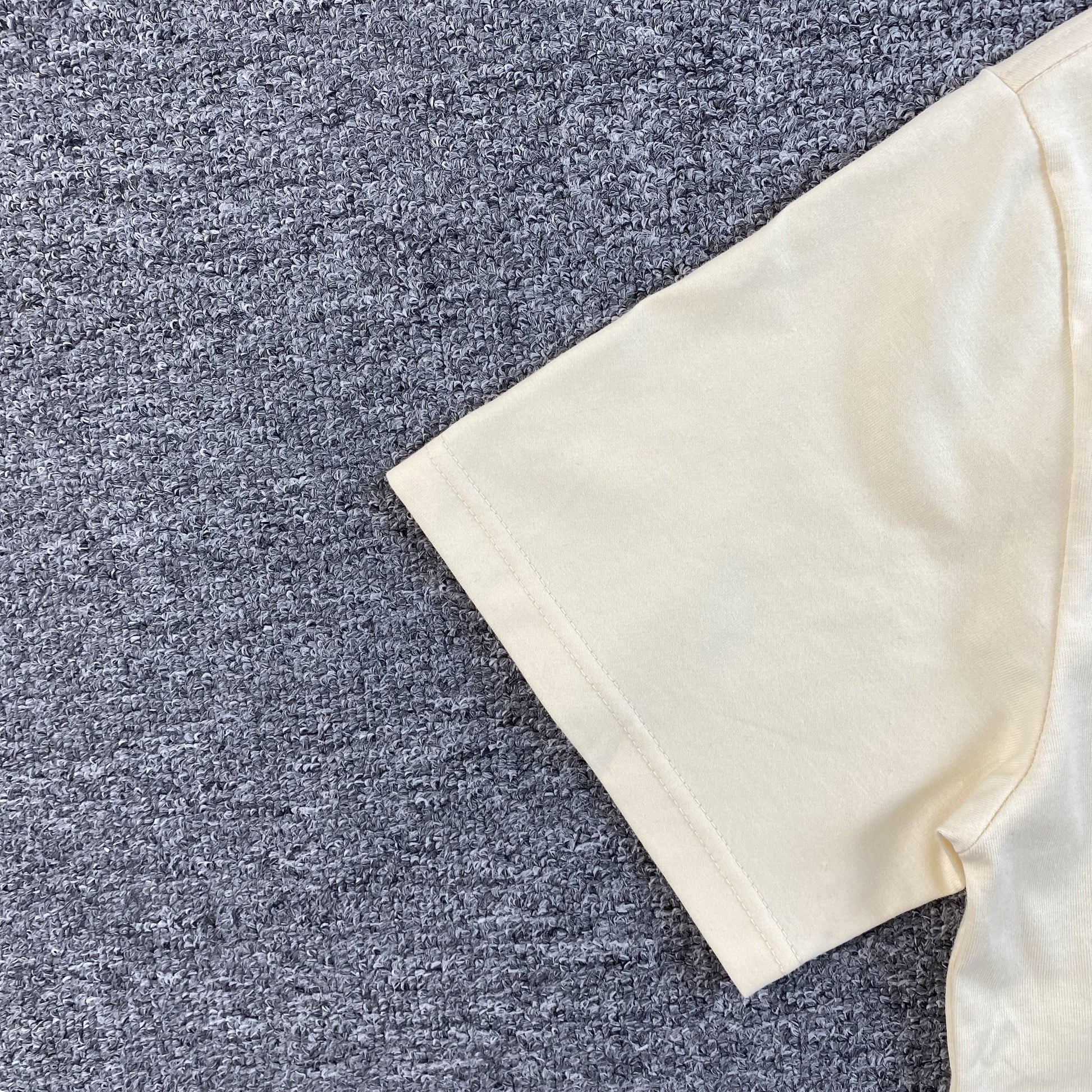 Crafted from premium heavyweight cotton, this t-shirt delivers a soft, structured feel with an oversized fit, ensuring maximum comfort and durability. The bone-colored base provides a clean, vintage-inspired look, allowing the high-contrast graphic to stand out with depth and detail. With a ribbed collar for enhanced durability and long-lasting wear, this tee is built for effortless styling and versatility.