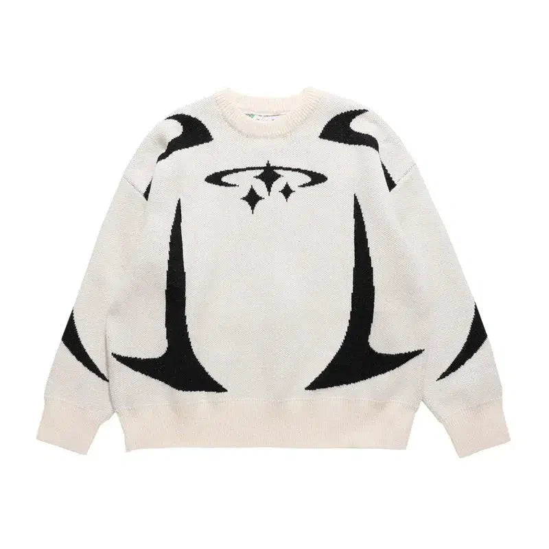 This jumper features a bold and distinctive star design, characterised by eye-catching graphic patterns that exude a nostalgic charm. Available in versatile shades of black, grey, and white, this piece is designed to complement any wardrobe.